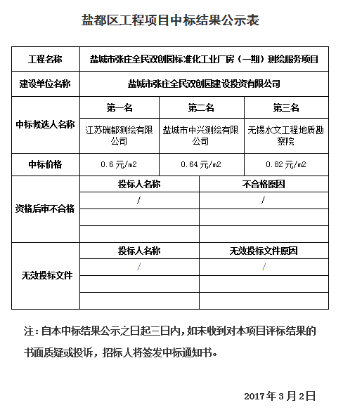 鹽城市張莊全民雙創(chuàng)園標準化工業(yè)廠房(一期)測繪服務項目中標公示