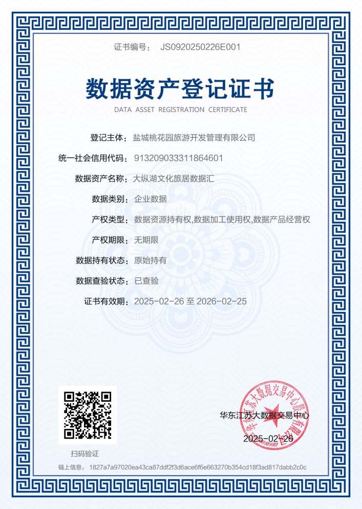 本次項目推進(jìn)過程中,集團(tuán)領(lǐng)導(dǎo)高度重視,以數(shù)據(jù)資產(chǎn)化試點項目為載體,構(gòu)建“政企研”協(xié)同機(jī)制,聯(lián)合華東江蘇大數(shù)據(jù)交易中心組建專項工作組,開展數(shù)據(jù)確權(quán)登記、質(zhì)量評估、成本核算等全鏈路標(biāo)準(zhǔn)化作業(yè)。“大縱湖文化旅居數(shù)據(jù)匯”數(shù)據(jù)資產(chǎn)成功在華東江蘇大數(shù)據(jù)交易中心完成數(shù)據(jù)資產(chǎn)登記,入表資產(chǎn)價值近千萬元,同期,成功在南京銀行鹽都支行獲得500萬元的授信貸款。集團(tuán)成功實現(xiàn)“數(shù)據(jù)資產(chǎn)登記+授信”雙重突破,貫通數(shù)據(jù)要素“資源-資產(chǎn)-資本”的三級躍升,重構(gòu)文旅企業(yè)“輕資產(chǎn)、高價值”的融資生態(tài),打造數(shù)據(jù)要素驅(qū)動產(chǎn)業(yè)升級的行業(yè)標(biāo)桿樣本。